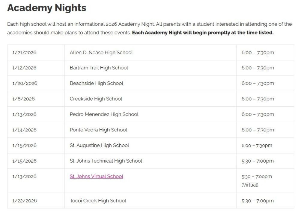 Rising 9th graders are able to apply for an academy at any St. Johns County Public School. Admissions into academy programs are done through a lottery system. If admitted into an academy program, students can attend an out of zone school. However, transportation is not provided.
